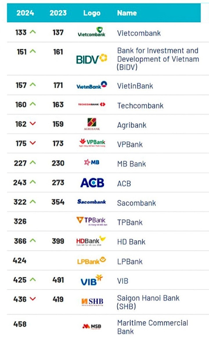 3 ngân hàng có mức tăng bậc nhẹ là Ngân hàng TMCP Ngoại thương Việt Nam (Vietcombank) tăng 4 bậc từ thứ 137 của năm 2023 lên thứ 133 của năm 2024. Còn lại 2 ngân hàng đều tăng 3 bậc là Ngân hàng TMCP Kỹ Thương Việt Nam (Techcombank) và Ngân hàng TMCP Quân đội (MB), với mức tăng tương ứng từ thứ 163 và 230 của năm 2023 lên thứ 160 và 227 của năm 2024.