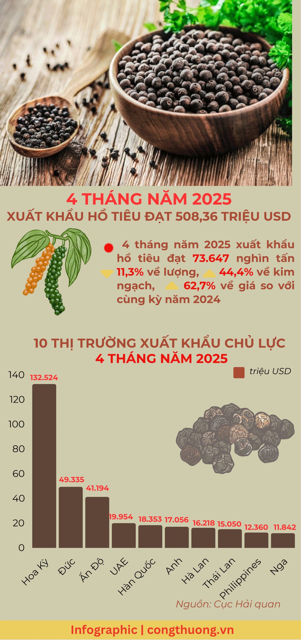 Theo thống kê từ Cục Hải quan, xuất khẩu hồ tiêu của Việt Nam trong 4 tháng đầu năm 2025 đạt 73,65 nghìn tấn, trị giá 508,36 triệu USD, giảm 11,3% về lượng nhưng tăng 44,4% về trị giá và tăng 62,7% về giá so với cùng kỳ năm 2024.