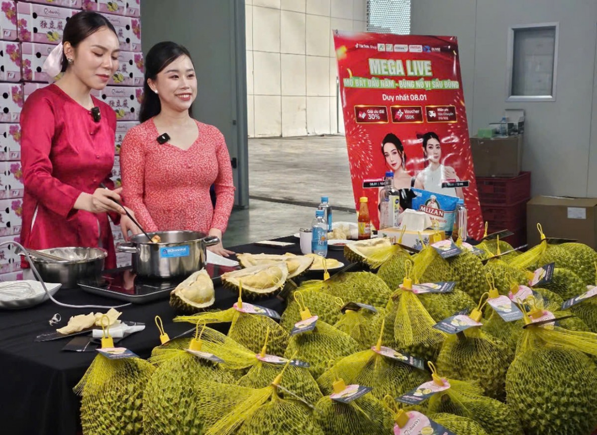 | Phiên Megalive sản phẩm sầu riêng cấp đông đạt tiêu chuẩn OCOP 5 sao tại nhà máy 1 của doanh nghiệp Chánh Thu, xã Hòa Nghĩa, huyện Chợ Lách. Ảnh: T.T |