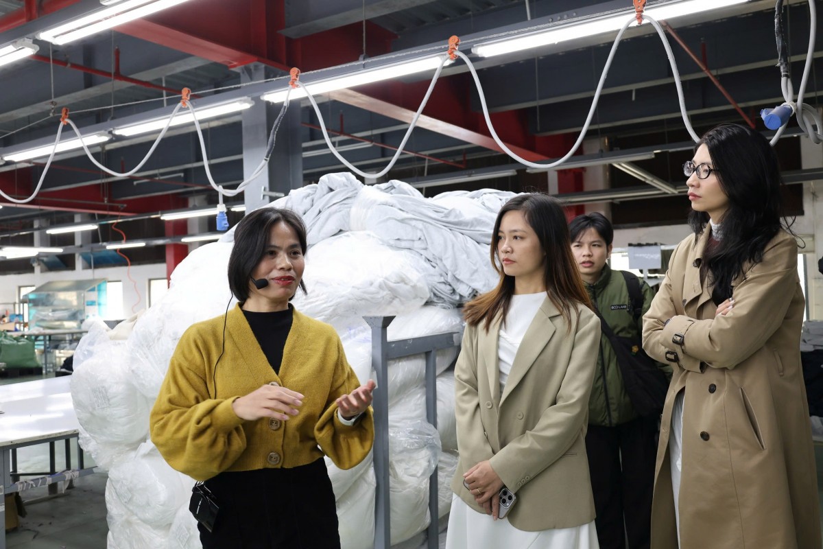 | Đại diện nhà máy sản xuất của Canifa chia sẻ về quy trình sản xuất theo chuỗi khép kín với đại diện TikTok Việt Nam trong chương trình GreenUp. Ảnh: Đ.N |