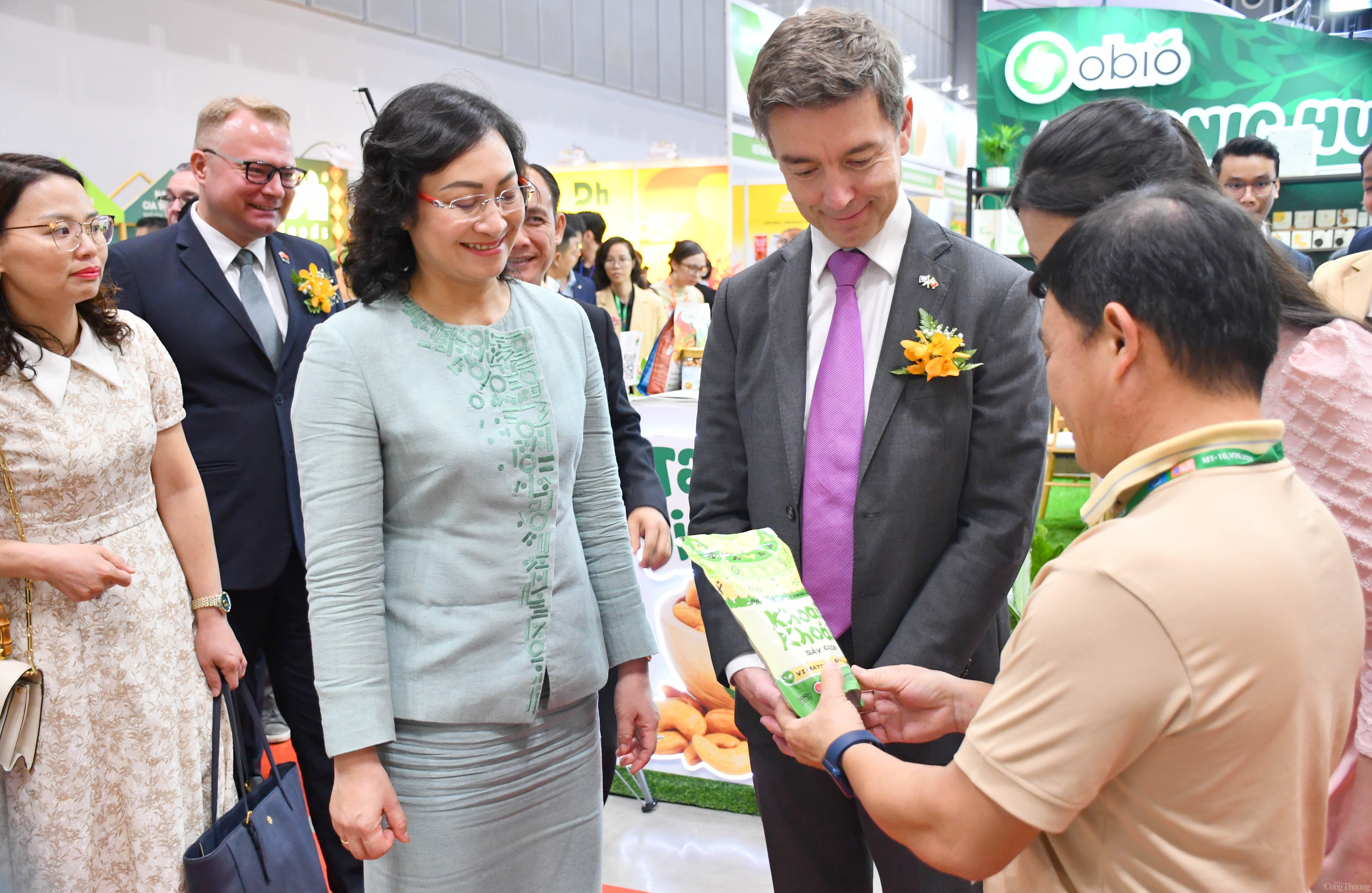 | Thứ trưởng Phan Thị Thắng cùng đoàn đại biểu tham quan tại triển lãm |
