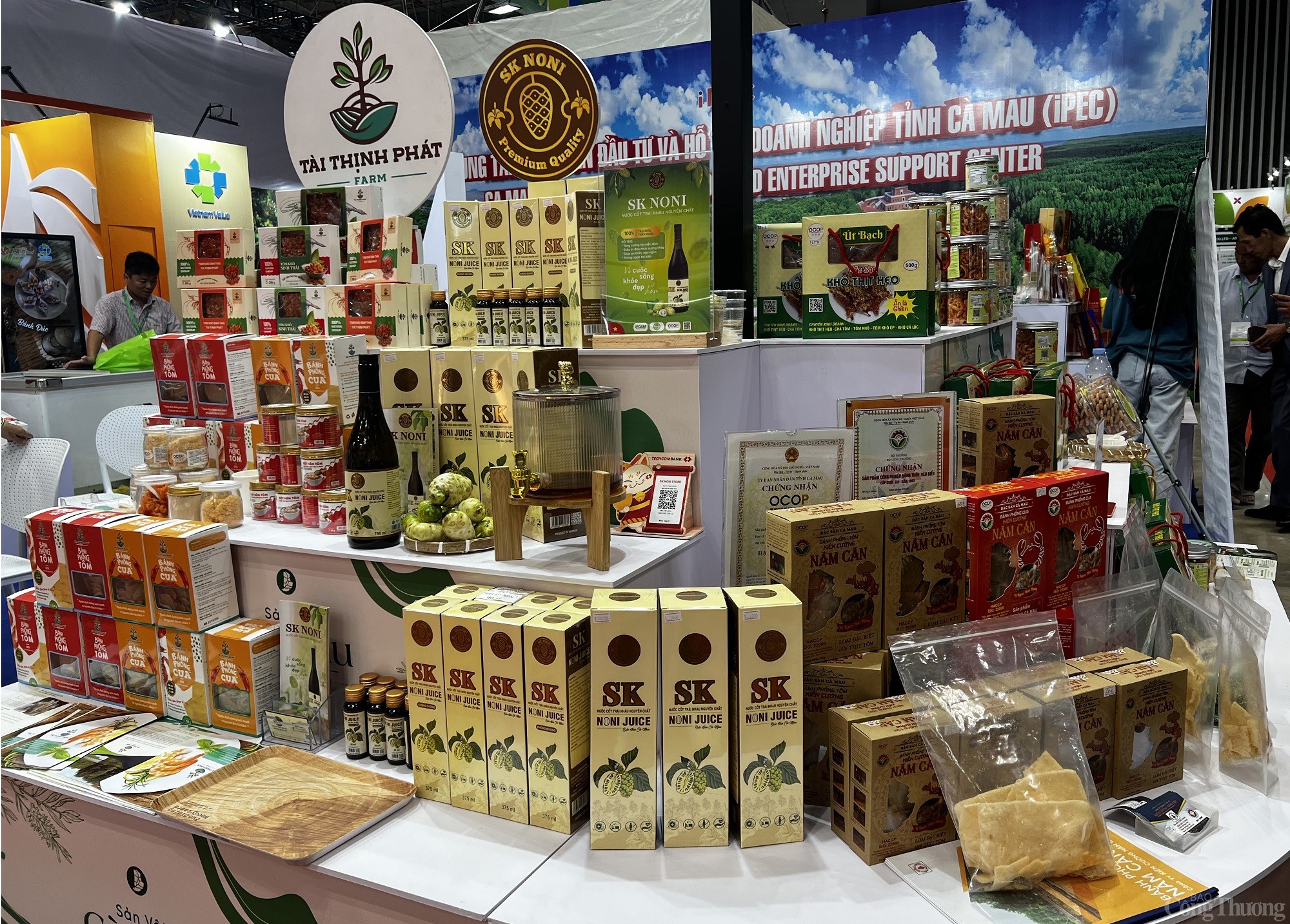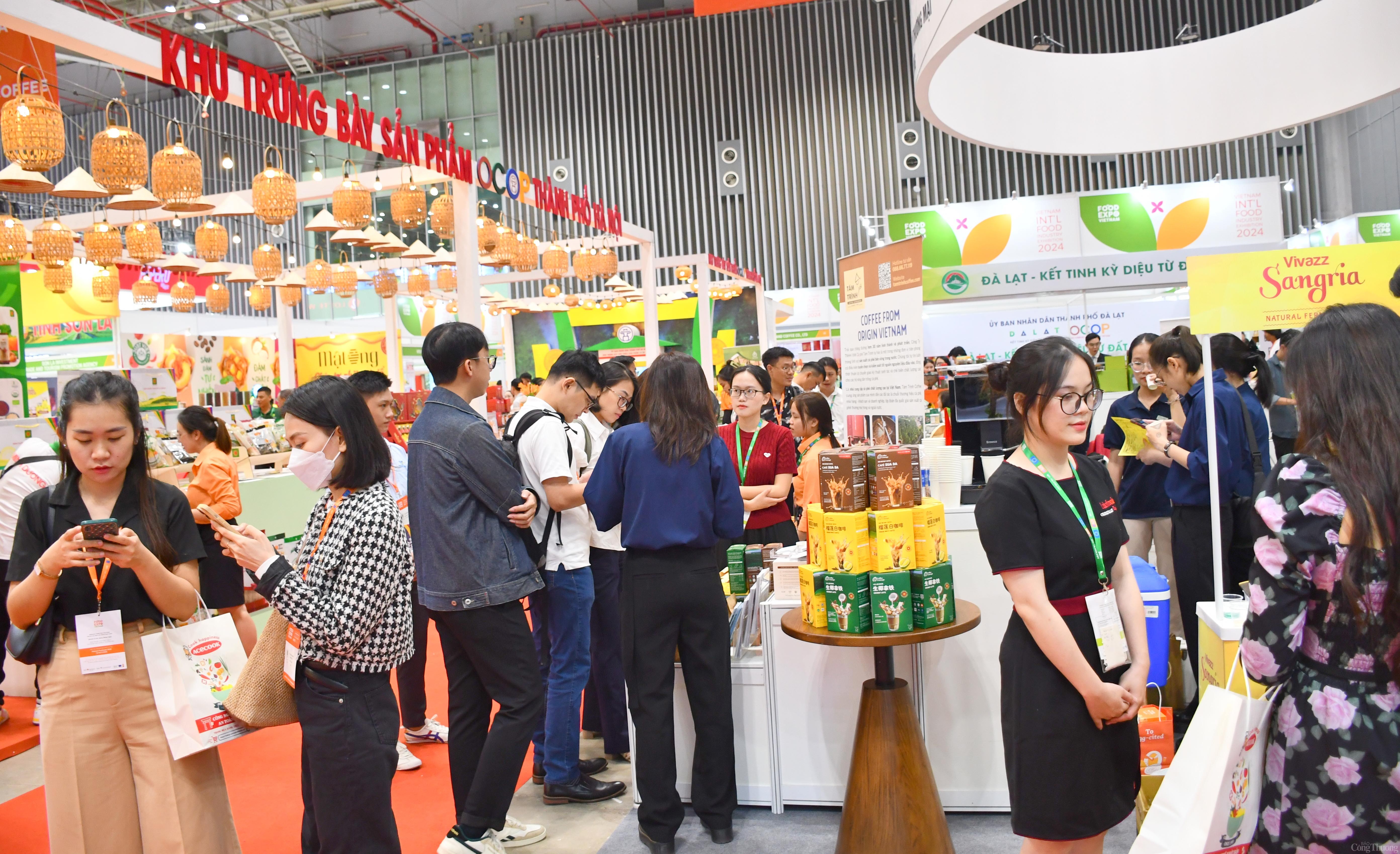 | Các gian hàng Thương hiệu Quốc gia, sản phẩm OCOP hút khách tại Vietnam Foodexpo 2024. |