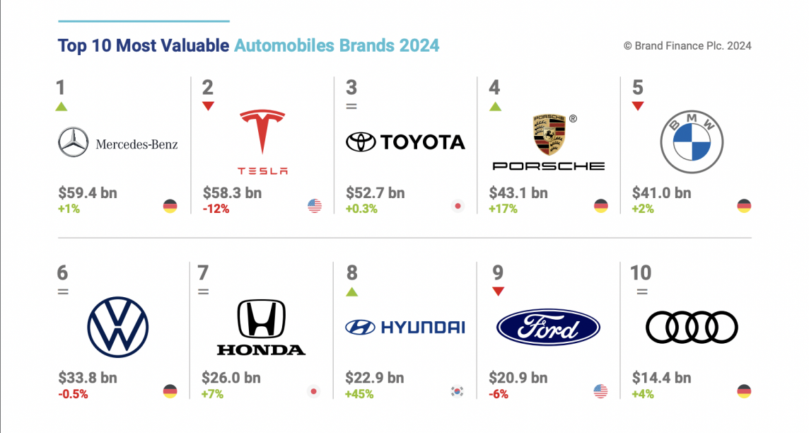 Top 10 thương hiệu ô tô giá trị nhất thế giới 2024 theo Brand Finance
