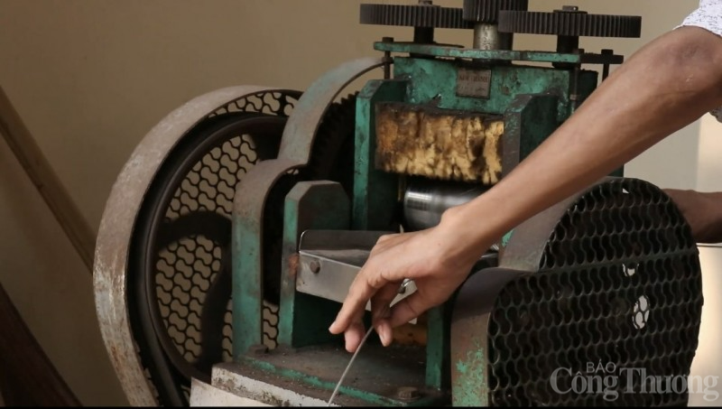 | Trong quá trình đậu bạc, các thanh bạc được vào máy cán cho phẳng, mịn và không đứt đoạn. (Ảnh Ngọc Anh) |