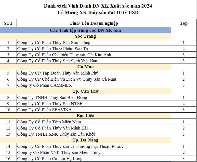 Tại Lễ mừng xuất khẩu thủy sản đạt 10 tỉ USD năm 2024, Hiệp hội Chế biến và Xuất khẩu thủy sản Việt Nam (VASEP) đã vinh danh 49 doanh nghiệp xuất khẩu thủy sản xuất sắc. Trong đó, có nhiều thương hiệu nổi tiếng như: Tập đoàn Thủy sản Minh Phú; Thủy sản Sóc Trăng; Thủy sản Biển Đông; Tôm miền Nam; Thủy sản Thuận Phước; Vĩnh Hoàn; Sài Gòn Foods...