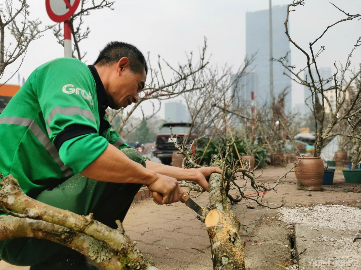 | Anh Bùi Thanh Bình - một tiểu thương buôn cành lê tại đường Lạc Long Quân cho biết, anh bám trụ trên tuyến đường này đã gần một tháng nay, trước Tết anh bán cành đào, ngay sau kỳ nghỉ Tết Nguyên đán anh đã vận chuyển những cành lê từ trên miền núi về để phục vụ người chơi. |