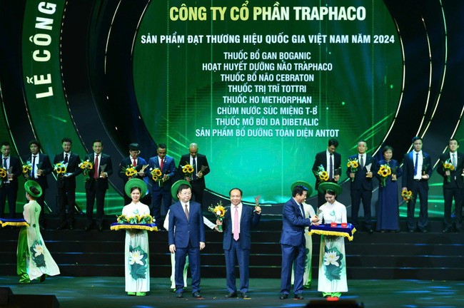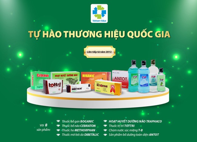 Theo đó, Công ty Cổ phần Traphaco vinh dự trở thành doanh nghiệp lần thứ 7 liên tiếp có sản phẩm đạt danh hiệu Thương hiệu Quốc gia Việt Nam. Cụ thể, năm 2024, Traphaco được công nhận với 8 thương hiệu sản phẩm đạt danh hiệu Thương hiệu Quốc gia, bao gồm: Thuốc bổ gan Boganic; Hoạt huyết dưỡng não Traphaco; Thuốc bổ não Cebraton; Thuốc trị trĩ TOTTRI; Thuốc ho METHORPHAN; Chùm nước súc miệng T-B; Thuốc mỡ bôi da Dibetalic; Sản phẩm bổ dưỡng toàn diện Antot.